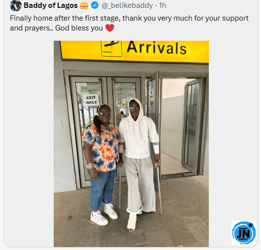 Upon landing at Nigeria’s international airport, Baddy took to his X page to update his fans and well-wishers, expressing gratitude for the overwhelming support he received throughout the process. The post included a heartfelt caption thanking everyone who contributed and prayed for his recovery, highlighting the impact of collective goodwill on his journey back to health.