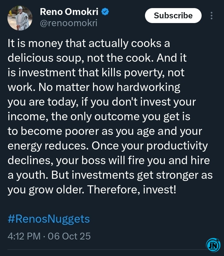 Former presidential aide and social commentator, Reno Omokri, has once again sparked a heated debate across social media after sharing a thought-provoking post about the relationship between money, hard work, and investment.