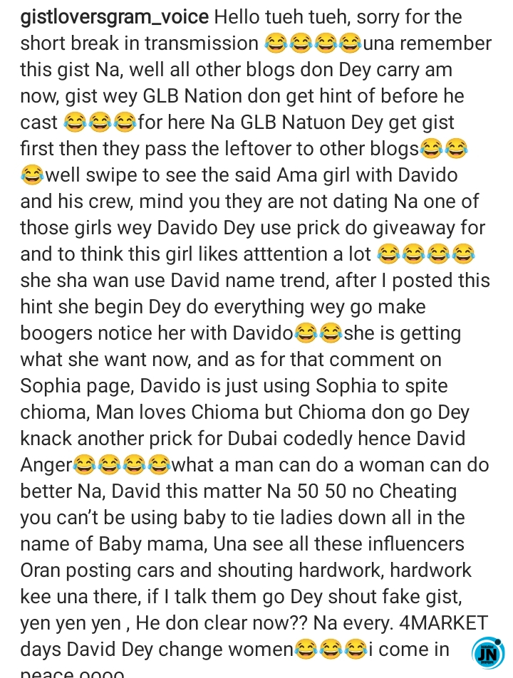 After I posted this hint she begin Dey do everything wey go make bloggers notice her with Davido she is getting what she want now, and as for that comment on Sophia page, Davido is just using Sophia to spite chioma, Man loves Chioma but Chioma don go Dey with another guy for Dubai codedly hence David Anger, what a man can do a woman can do better Na.