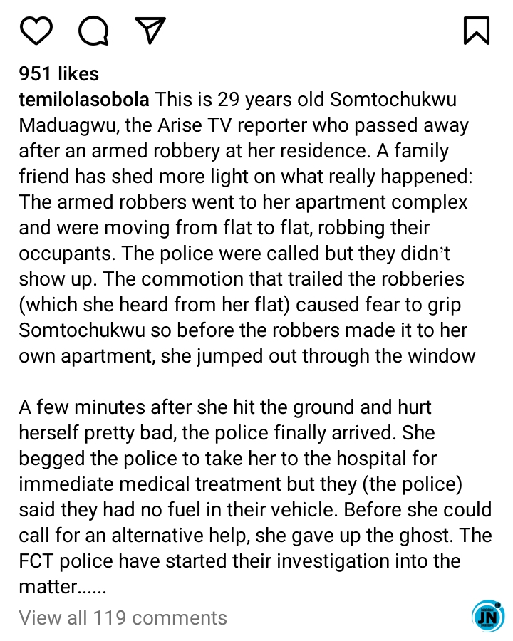 “This is 29 years old Somtochukwu Maduagwu, the Arise TV reporter who passed away after an armed robbery at her residence. A family friend has shed more light on what really happened: The armed robbers went to her apartment complex and were moving from flat to flat, robbing their occupants. The police were called but they didn’t show up. The commotion that trailed the robberies (which she heard from her flat) caused fear to grip Somtochukwu so before the robbers made it to her own apartment, she jumped out through the window. A few minutes after she hit the ground and hurt herself pretty bad, the police finally arrived. She begged the police to take her to the hospital for immediate medical treatment but they (the police) said they had no fuel in their vehicle. Before she could call for an alternative help, she gave up the ghost. The FCT police have started their investigation into the matter……”