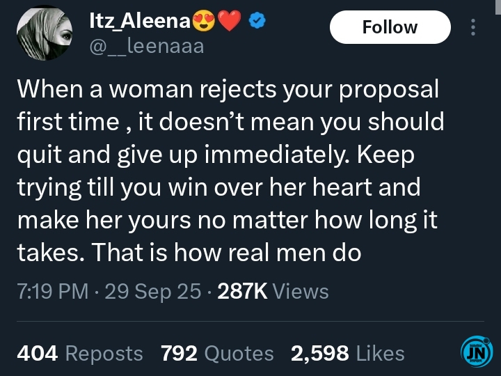 A young lady has set social media abuzz after she shared a controversial opinion encouraging men not to immediately give up when a woman rejects their proposal the first time.