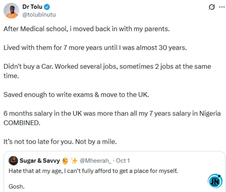 The doctor shared this story in response to a Nigerian lawyer expressing frustration over financial struggles, particularly her inability to afford rent for her own apartment. Dr. Binutu’s message was meant as an inspiration, showing that consistent effort and strategic career moves can dramatically improve one’s financial situation. He concluded with a motivational note: “It’s not too late for you. Not by a mile,” encouraging young professionals not to lose hope and to consider global opportunities as a viable path to financial stability and personal growth.